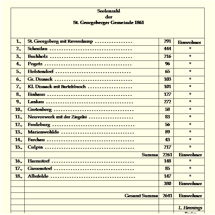Abschrift der Aufstellung von Pastor Hennings, St. Georgsberg,